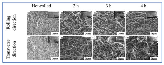 The fracture morphologies of the samples are shown in Figure 10. The macroscopic fracture morphologies in the RD and TD directions were relatively uneven and showed a dark gray fiber shape, which had a certain degree of necking. The fractures of the hot-rolled and heat-treated samples were composed of dimples with different sizes; they were deep and there were many small dimples in the large dimples. Moreover, the fracture dimples became larger with increase in aging time and all the samples were ductile fractures. The small dimples were formed by the secondary α, flaky α phase, and β phase, and the large dimples were formed by the equiaxed α-phase [17]. With increasing aging time, the volume fraction of the secondary α-phase and transformed β-phase declined, and the volume fraction of the equiaxed α-phase increased. Therefore, the fracture dimple became larger with increase in aging time. This phenomenon was also observed in other studies [3,4]. In summary, the fracture dimples were ductile fractures in both the RD and TD directions and the plasticity was improved due to the dimples becoming larger with increase in aging time.