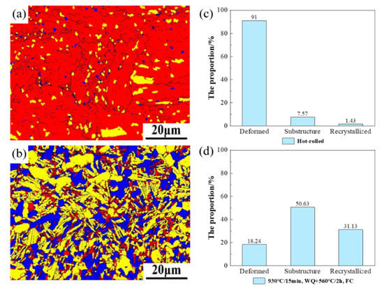 Recrystallized (blue), substructure (yellow), and deformed (red) grains in TC4 alloy: (a,c) Hot-rolled; (b,d) 930 °C/15 min, WQ + 560 °C/2 h, FC.