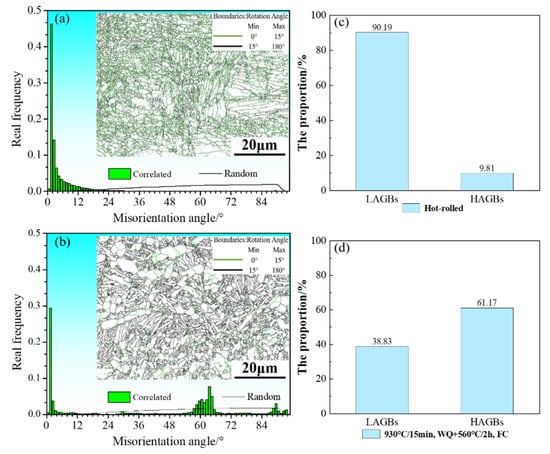 Misorientation angle distributions of TC4 alloy sheets: (a,c) hot-rolled; (b,d) 930 °C/15 min, WQ + 560 °C/2 h, FC.