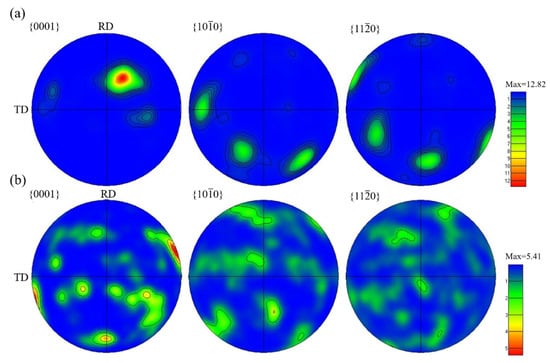 The pole figures (PFs) are shown in Figure 13. The hot-rolled sheet had a strong basal texture in the {0001} pole figure, and the c-axis of the grains was deflected away from the ND direction to the RD direction; the angle between the c-axis and ND direction was about 40°. There was variant distribution and coarsening behavior of the α-phase [33]. In this study, the intensity of the heat-treated sheet was lower than that of the hot-rolled sheet, and the c-axis of the α-phase grains was almost parallel to the TD, which showed typical transverse texture characteristics [34]. In summary, the hot-rolled and heat-treated sheets both had basal texture in the {0001} pole figure, and the intensity was obviously weakened after heat treatment. In addition, the grains rotated and the transverse texture appeared [35].