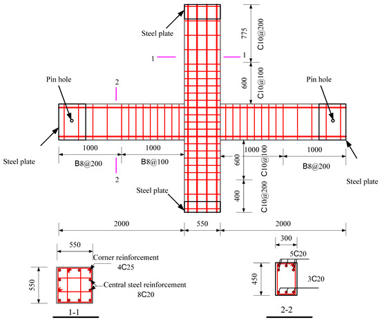 The specimens were tested, including a full-scale cast-in-place specimen and two full-scale precast specimens. The cast-in-place specimen was labeled as XJ, as shown in Figure 1. The length of the beams on both sides of the column was 2.0 m. Closed stirrups of B8 reinforcement bars were placed in the beam at a spacing of 100 mm from the column surface and 200 mm from both ends of the beam. Five C20 bars were placed at top of the beams, and three bars were placed at the bottom of the beams. The total height of the column was 2.825 m. Four C25 and eight C20 bars were placed in the column. The column stirrup spacing was 100 mm within the panel zone and within the range of 600 mm at the top and bottom of the panel zone. The stirrups in the other parts of the column were B10@200. The ends of the column and the beam were wrapped with a rectangular steel hoop to prevent local damage during the test. Precast beams and precast columns were assembled into a precast connection, and the precast column reinforcement and cross-section of the two precast connections were the same, as shown in Figure 2. The lengths of the bottom-column bars protruding from the upper surface of the column were 670 mm and 630 mm, respectively. The precast beams of YZ1 and YZ2 specimens are shown in Figure 3 and Figure 4. The section height of the precast beam was 550 mm, which consisted of a 330 mm precast beam and a 120 mm laminated layer. The bottom force bars of the YZ1 precast beam extend 450 mm outwards and bend upwards by 200 mm. The end of the strands at the bottom of the YZ2 precast beam adopted embossed anchors to enhance the new anchoring performance between the strands and the concrete. The precast beams of the two prefabricated connections were provided with a keyway with a length of 600 mm at the beam end, while the thickness of the sidewall of the keyway was 50 mm, and the thickness of the bottom wall was 65 mm. Two C10 steel bars were used in the keyway at 150 mm from the bottom of the beam to facilitate the fixation of the core beam stirrup. More details can be found in Figure 5 and Figure 6.