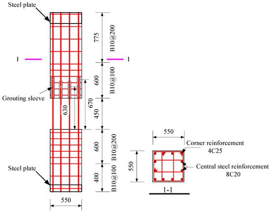 The application of concrete has a long history, and the research on concrete structures has never ceased, especially regarding concrete beams, columns, walls and slabs [1]. However, with the increasing awareness of environmental protection and the aging of on-site workers, conventional cast-in-place concrete may be replaced by other construction methods shortly due to its labor-intensive and resource-intensive characteristics. The use of precast concrete structural systems can reduce the environmental impact, and this type of construction can effectively reduce the labor force on the construction site and solve the problem of labor aging [2,3,4,5]. The precast concrete frame structure has the advantages of a flexible building layout, easy standardization of beams, columns, and other components, high prefabrication rate, and wide application range. For example, some large open space factories, shopping malls, parking lots, office buildings, teaching buildings, hospitals, and other buildings can adopt precast frame structures, which is a structural system that is widely studied and applied in precast structures [6]. A precast frame structure refers to prefabricated columns and beams which are processed in a precast factory, transported to the construction site, and then assembled to form an overall structure [7]. However, the panel zone of the precast concrete frame is often a weak part of the structure. The connection of beams and columns directly affects the stability and seismic resistance of the overall structure. Therefore, ensuring that the panel zone of the precast frame structure has good mechanical properties is of great significance to the safety of the overall structure [8,9]. Since the 1990s, various new connection types suitable for use in seismic areas have been proposed for precast structures, and a series of experimental studies and theoretical analyses have been performed [10]. At present, the most widely used and researched type of connections are the wet connections, also known as the prefabricated post-cast integral frame beam-column connection. The research mainly focuses on the related properties of its connecting steel bar, steel connecting form and post-cast concrete, and finally puts forward a series of measures to effectively improve the performance of beam-column connections [11].