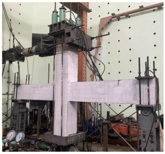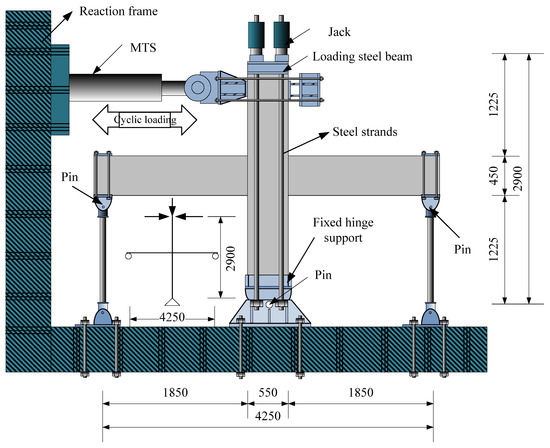 In this test, a 1500 kN hydraulic servo control system (MTS) was used to apply a horizontal load on the top of the column. The axial load of the column was applied to the steel strand through a through-hole jack. The axial pressure ratio was controlled to 0.27, corresponding to the axial load carrying capacity. The loading device is shown in Figure 8.