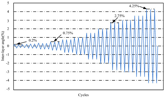 For quasi-static loading tests, Chinese code recommends the use of a load-deformation dual-control loading system (JGJ/T 101, 2015) [25]. However, human subjectivity often plays a big role in the conversion of load to deformation. This loading is according to the used drift ratio control (ACI 374.1-05, 2005) [26]. The drift ratio is the ratio of the actuator loading displacement to the distance of the inflection point of the column. Before the formal loading, pre-apply a displacement of 1–2 mm to the specimens. The drift ratios were 0.2%, 0.25%, 0.35%, 0.5%, 0.75%, 1%, 1.5%, 2%, 2.75%, 3.5%, and 4.25%. Each cycle was repeated three times, as shown in Figure 9.