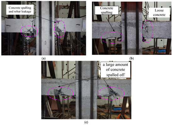 There were no cracks that appeared during preloading with a drift ratio of 0.034% and 0.069%. The specimen was loaded with a 0.2% drift ratio for the first stage, and several cracks at the bottom of the beam appeared at approximately 5 cm, 10 cm, 35 cm, and 62 cm from the beam-column joint surface. When loading at a drift ratio of 0.35%, a crack with a width of 0.06 mm at the top of the beam appeared at approximately 55 cm from the beam-column joint surface. When loaded at a 0.5% drift ratio, there were many vertical bending cracks at the top of the beam, and the cracks in the upper and lower beams penetrated each other. When loaded to a 0.75% drift ratio, visible cracks appeared at the beam-column junction with a width of 0.6 mm. As the loading drift ratio increased, the width, length, and number of cracks increased. The distribution of the cracks gradually expanded toward the loading end, and the number of diagonal cracks increased. When loaded at a drift ratio of 4.25%, the concrete at the lower end of the beam experienced substantial spalling. It was observed that the lower longitudinal rebar was bent when it was compressed. At a distance of 10 cm from the beam-column interface, a wide main crack formed in the middle of the beam, and the load dropped significantly, lower than 80% of the peak load, and the loading was complete. The final failure pattern of specimen XJ is shown in Figure 10a.