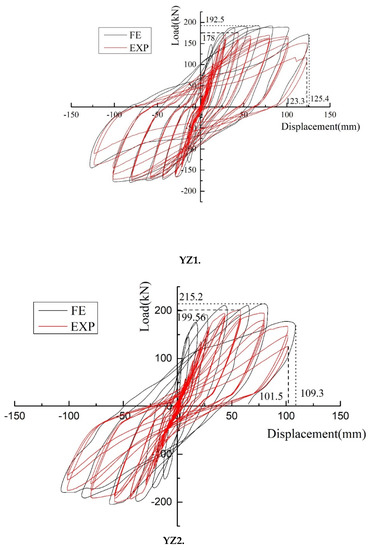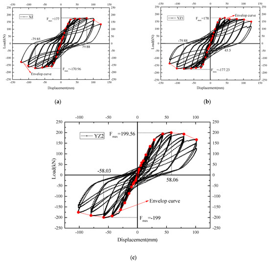 - It can be seen in the YZ1 specimen that the hysteresis loop changes similar to that of the XJ specimen. However, the hysteresis capability of the YZ1 at the level of 101.5 mm is still strong. Compared with the XJ specimen, the yield load and ultimate load are similar, and the hysteresis curves are identical. However, the pinch phenomenon of the YZ1 specimen was better than that of the XJ specimen at 123.3 mm. The hysteresis and ultimate load-carrying capacity of the YZ1 specimen were stronger than those of the XJ specimen.