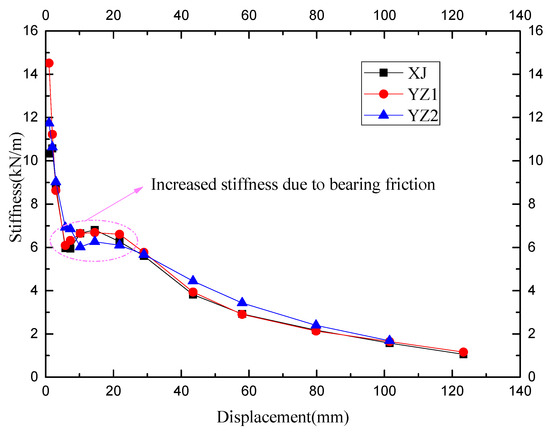 It can be found in Figure 12 that the initial rigidity of the XJ specimen is slightly higher than that of the YZ series. This indicates that the existence of seams between the precast components weakens the overall rigidity of the precast specimens. After cracking, the stiffness of the cast-in-place specimen and the precast specimen are the same. All the specimens are in the range of the sixth cycle load to the twentieth cycle load (ranging from a drift ratio of 0.25% to 1%), and the stiffness value has slightly increased. This is due to the accuracy of the rotating support and the fixed base at the bottom. Friction occurs during the rotation at a drift ratio of 0.25% to 1%. Therefore, the stiffness in this range increases due to friction. After the drift ratio reaches 1%, all the specimens enter the yielding state. Although the total reinforcement of the precast specimens is low, the stiffness of the YZ1 after yielding is the same as that of the XJ. The stiffness of the YZ2 after yielding is higher than that of the XJ, indicating that the core beam in the keyway and the configuration of the high-strength tendons can increase the stiffness of the joint after yielding to a certain extent.