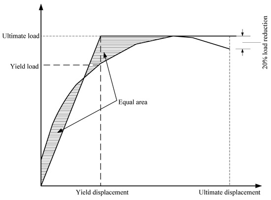 The equivalent area method has a relatively clear physical meaning and is widely accepted to determine the yield point [27]. In this research, the area of the equivalent two-fold line and the original curve envelope are equal. The point on the original curve corresponding to the turning point of the equivalent bi-linear model is considered to be the yield point. The schematic diagram is shown in Figure 13.