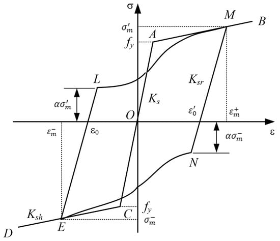 The constitutive model of rebars was shown in Figure 17 [30], OAB and OCD were the tension and compression envelopes of the steel bars, respectively, MN and KL were the unloading sections, LM and NK were the reload sections; M and K were the historical maximum tensile and compressive stress and strain points. Use to indicate the maximum tensile stress, to indicate the maximum compressive stress, to indicate the maximum tensile strain, and to indicate the maximum compressive strain. The intersection points of the tension and compression unloading section and the strain coordinate axis were represented by and , respectively. The α was called the influence coefficient of hysteretic energy consumption; Ks was the initial stiffness; Ksh was the hardening stiffness; Ksr was the unloading stiffness.
