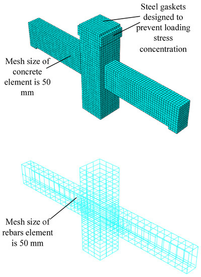 Combined with the stress characteristics of the concrete materials, and ignoring the tensile strength of the concrete and the interface bonding force, the contact interface between the precast concrete and the cast-in-place concrete is mainly considered to bear the normal extrusion force and tangential friction force. A variety of interface simulation methods are provided in the ABAQUS software, which can conveniently and quickly simulate the normal extrusion force and tangential friction force of the concrete interface. First, the characteristics of the contact need to be created, and the mechanical properties of the contact surface can be simulated by defining the tangential and normal behavior. For the tangential behavior, this study utilizes the “penalty” friction function with a friction coefficient of 0.6, which is taken as the friction coefficient between the rough concrete surfaces. For normal behavior, this study utilizes hard contact to consider the problem of contact pressure interference and to allow for separation after contact. If the gap between the interface of the precast concrete and the cast-in-place concrete is 0, the contact constraint is achieved through extrusion force. If the gap is less than 0, the two contact surfaces will be separated from each other due to the software parameter settings. Then, the created contact attributes are assigned to the corresponding interface through surface-to-surface contact simulation.