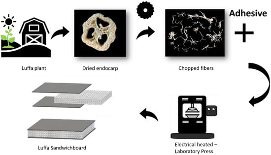 The manufacturing process is shown in Figure 1 and is divided into five parts. The core material of the sandwich panels consists of the dried fibers of the Luffa plant, which come from production leftovers from the cosmetics industry (Ibérica de esponjas vegetales s.l.u, Pontevedra, Spain).