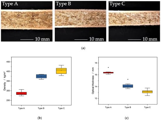 Figure 3 shows the density curve across the panel cross-section. The edge layers exhibit a density of 550–600 kg/m3 [], which can be assigned to the beech veneers. It follows, at a thickness of 1.5–2 mm, an increase in density to a value of 650 kg/m3, which can be attributed to the adhesive layer []. As the profile progresses, the different densities of the individual types A, B, and C core materials can be differentiated from the edge layers []. The density profiles support the results of Figure 2a where type A has the lowest density followed by type B and type C. The lowest core density of about 200 kg/m3 is attributed to type A. Whereas type B and type C exhibit a higher core density. When comparing the density curves in Figure 2 and the raw densities in Figure 3, it can be observed that the edge layers and the beech veneers have a high influence on the total density.