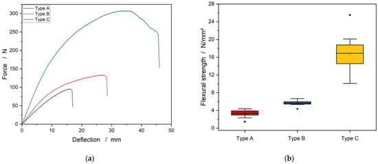 With the smallest fiber-to-adhesive ratio in the type A panel, maximum flexural strength of 3.3 N/mm2 was achieved on average (Figure 4b), with a modulus of elasticity of 276.1 N/mm2. During the tests, it was noticed that the amount of adhesive was not sufficient to transfer the forces inside the fiber core evenly to all fibers (comparable to FRP, see [,]) and to cross-link all fibers. This led to the splitting of the specimens, i.e., a fibrous rupture of the fiber core and delamination of the cover layers.