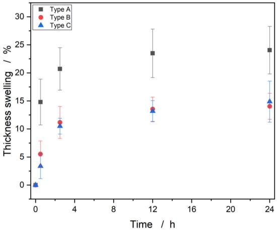 The thickness swelling was analyzed in accordance with the European standard EN 317 []. Eight samples with dimensions of 50 mm × 50 mm (L × W) were determined whereas the samples were stored in water for 0.5, 2.5 h, 12 h, and 24 h, using an outside micrometer. The measurement was performed at 20 °C and 65% relative humidity
