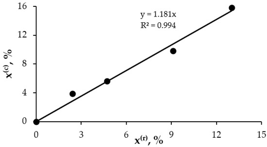 An increase in the concentration of the amphiphilic N-vinyl-2-pyrrolidone copolymer containing 3.9 mol% of acrylic acid also slowed the release of doxorubicin and reduced the equilibrium conversion of this process (Figure 8A). The experimental kinetic curves also remain linear in the “ vs. t” coordinates (Figure 8B), which makes it possible to calculate all kinetic parameters in accordance with the Equations (5)–(8). Doxorubicin release rate constants () were 2.56 × 10−2 h−1, 2.16 × 10−2 h−1, 1.65 × 10−2 h−1 and 8.77 × 10−3 h−1 in the presence of amphiphilic N-vinyl-2-pyrrolidone and acrylic acid copolymers (x(c) = 3.9 mol%) of various concentrations: 2.5 × 10−3 g.mL−1; 5.0 × 10−3 g.mL−1; 10−2 g.mL−1; 1.5 × 10−2 g.mL−1. Doxorubicin binding rate constants () were 0.113 h−1, 0.133 h−1, 0.153 h−1 and 0.186 h−1 in the presence of N-vinyl-2-pyrrolidone and acrylic acid copolymers (x(c) = 3.9 mol%) of various concentrations: 2.5 × 10−3 g.mL−1; 5.0 × 10−3 g.mL−1; 10−2 g.mL−1; 1.5 × 10−2 g.mL−1.