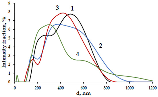 Intensity diameter distributions of particles formed as a result of self-assembly of the chains of amphiphilic copolymers of N-vinyl-2-pyrrolidone and acrylic acid with a mole fraction of acrylic acid residues as follows: 1—3.9 mol%; 2—5.6 mol%; 3—9.8 mol%; 4—15.8 mol%.