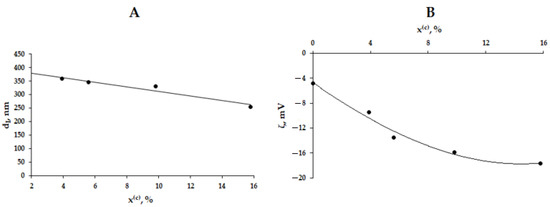 The electrostatic stabilization effect of the nanoparticles with an increase in the mole fraction of acrylic acid residues in the chain of the amphiphilic copolymer was consistent with the curves of the numerical distribution of particle diameters (Figure 4A). As can be seen, the number average particle diameter was much more sensitive to changes in the share of carboxyl groups in the chain (Figure 4B) than the intensity-average diameter (Figure 3A). In addition, for the copolymer containing 15.8 mol% of acrylic acid residues there was no pronounced peak above 40 nm on the curves of the numerical distribution of particle diameters. Thus, the system contains a significant number of nanoparticles under 40 nm in diameter along with large aggregates, the number of which is small, while the amphiphilic copolymer mass contained therein is significant. On the contrary, for particles containing 3.9 mol% acrylic acid residues, the diameter distribution had a pronounced bimodal character, which is associated with insufficient electrostatic stabilization of the nanoparticles (Figure 4A).