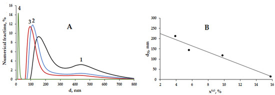 (A) Numerical diameter distributions of particles formed as a result of self-assembly of chains of the amphiphilic copolymers of N-vinyl-2-pyrrolidone and acrylic acid with a mole fraction of acrylic acid residues as follows: 1—3.9 mol%; 2—5.6 mol%; 3—9.8 mol%; 4—15.8 mol%; (B) Numerical -average diameter as a function of the mole fraction of acrylic acid residues in the chain.
