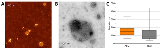 Characterization of the particles using AFM (A) and TEM (B). In the AFM image the vertical range is 10 nm. (C) Box-plot showing the particle diameter distribution. The plot shows the median (line), the 25th–75th percentile range (box), the 5th–95th percentile range (whiskers) and the mean (dot).