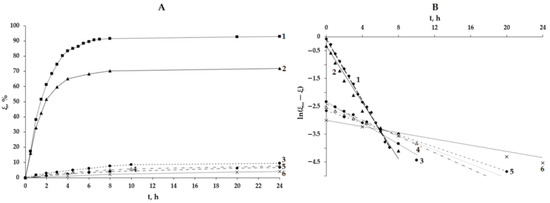 (A) Kinetic curves of doxorubicin release and (B) their linear anamorphoses in the “ vs. t” coordinates in the presence of N-vinyl-2-pyrrolidone copolymers containing various mole fractions of acrylic acid residues: 1—in the absence of copolymer additives; 2—0% (N-vinyl-2-pyrrolidone homopolymer); 3—3.9 mol%; 4—5.6 mol%; 5—9.8 mol%; 6—15.8 mol% ( and are the conversion and equilibrium conversion of doxorubicin release; —time).