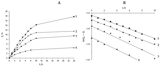 (A) Kinetic curves of release of doxorubicin and (B) their linear anamorphoses in the “ vs. t” coordinates in the presence of N-vinyl-2-pyrrolidone and acrylic acid copolymers (x(c) = 3.9 mol%) of various concentrations: 1—2.5 × 10−3 g.mL−1; 2—5.0 × 10−3 g.mL−1; 3—10−2 g.mL−1; 4—1.5 × 10−2 g.mL−1 ( and are the conversion and equilibrium conversion of doxorubicin release; —time).