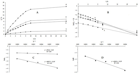 (A) Kinetic curves for doxorubicin release and (B) their linear anamorphoses in the “vs. t” coordinates in the presence of a copolymer of N-vinyl-2-pyrrolidone and acrylic acid (x(c) = 3.9 mol%; copolymer concentration 10−2 g.mL−1) at the following temperatures: 1—278 K, 2—298 K, 3—310 K and 4—323 K. The temperature dependences of (C) the rate constants (triangles) and (circles) and (D) the equilibrium constants (K) ( and are the conversion and equilibrium conversion of doxorubicin release; —time).