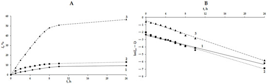 (A) Kinetic curves of doxorubicin release and (B) their linear anamorphoses in the “vs. t” coordinates in the presence of a copolymer of N-vinyl-2-pyrrolidone and acrylic acid (x(c) = 3.9 mol%; copolymer concentration 10−2 g.mL−1) in buffer solutions: 1—pH = 7; 2—pH = 9; 3—pH = 4. Temperature = 310 K ( and are the conversion and equilibrium conversion of doxorubicin release; —time).