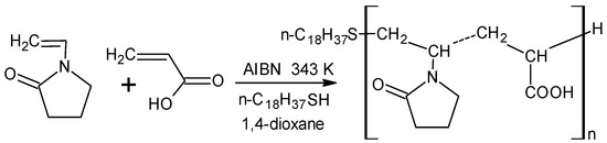 It was previously shown by the 1H NMR, 13C NMR, IR and MALDI-TOF spectroscopy methods that the radical copolymerization of N-vinyl-2-pyrrolidone and acrylic acid initiated by AIBN in the presence of n-octadecyl-mercaptan yields amphiphilic copolymers (Scheme 1) capable of forming nanosized aggregates in aqueous solutions [50,55].