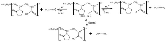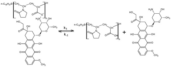 Apparently, the immobilization of doxorubicin is associated with electrostatic interionic interactions involving the carboxy group of acrylic acid residues, since the amphiphilic N-vinyl-2-pyrrolidone homopolymer only slightly slowed down the release of doxorubicin (Figure 7A). Thus, one may assume that an equilibrium is established as shown in Scheme 2.