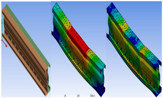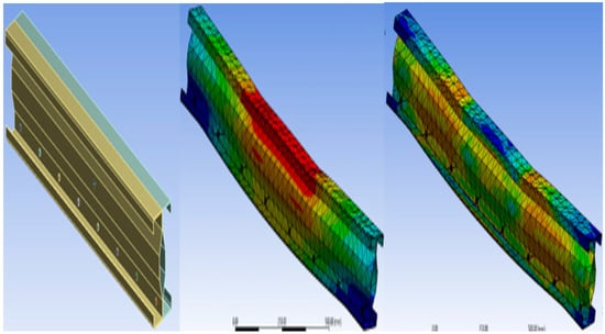 In this study, load versus deflection curves were plotted to study the critical flexural strength of the beams. The load and deflection values obtained from the Ansys workbench 16.1 are presented as follows: the B2B100 section has an ultimate load of 73.44 kN and the F2F100 section has a maximum load of 56.77 kN, which is a 22.6% decrease in the load-carrying capacity compared with the standard section B2B100 and, finally, B2B157 has an ultimate load of 87.05 kN which is a 15.6% increase in the load-carrying capacity compared with the standard section B2B100. The load versus deflection behavior is presented (Figure 7).