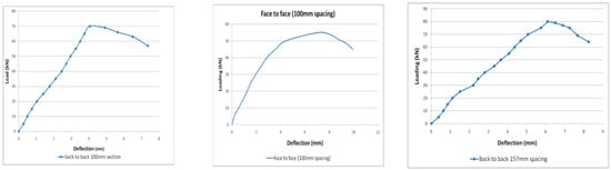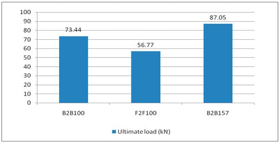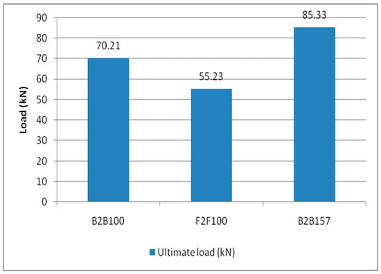 The many criteria discussed included ultimate load bearing capability, buckling mode, and load–deflection behaviour. The loads corresponding to the maximum deflection for B2B100mm, F2F100mm, and B2B157mm were plotted for both analytical and experimental investigations. It is clear from Table 3 that the experimental method has a greater load value than the analytical method, especially in B2B157, which has 18.6% and 21.4% greater load carrying capacity than B2B100 in the analytical and experimental investigations, respectively, as shown in Figure 15. The results are comparable to the existing outcomes [,,].