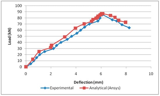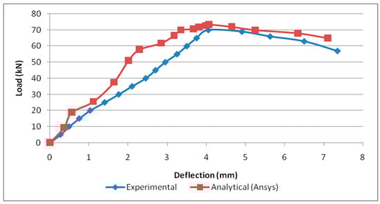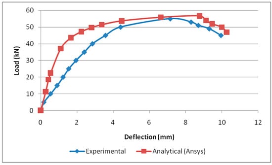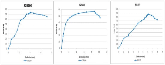 The load correlating to the deflection comparison for specimens B2B100, B2B157, and F2F100 for both analytical and experimental behaviour was plotted as shown in Figure 16, Figure 17 and Figure 18. This analytical behavior has a somewhat greater value than the experimental behavior and, in addition, the outcomes exhibit a similar trend variation to the existing outcomes [,].