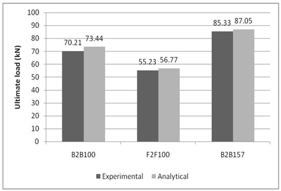 Comparative bar chart of the experimental and analytical results of ultimate load-carrying capacity.