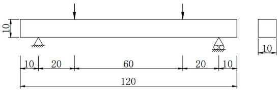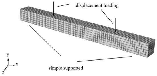 The constraint on the lower left end of the beam was set as a fixed hinge support, and it constrains displacement in the x-, y-, and z-directions and rotation in the x- and y-directions. The lower right end constraint was set as a rolling hinge support, and it constrains displacement in the y- and z-directions and rotation in the x- and y-directions (Figure 3).