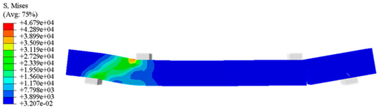 Figure 4 presents a stress nephogram for the concrete in the experimental group under the broken load. The stresses near the fixed constraint and the load of the concrete beam are larger than that in the middle. When the tensile strength of the concrete reaches ultimate strength, the concrete crack occurs at the load-bearing portion on the left. Taking experimental groups as an example, the simulation results were shown.