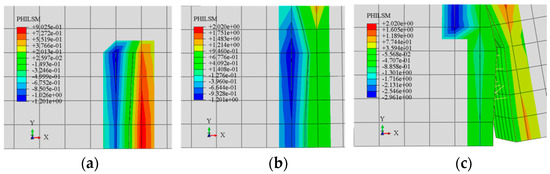 The signed distance function (PHILSM) in ABAQUS is the level set function used to describe the development of the crack surface, in which the PHILSM value transitions from negative to positive unit is the location of the crack surface. Figure 5 shows the simulated crack propagation process in concrete beam at different loads.