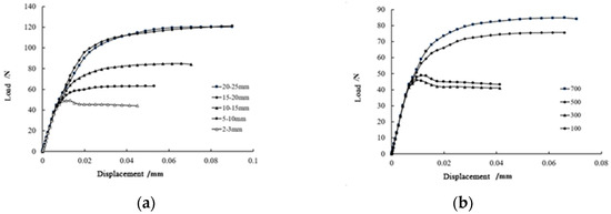 In Figure 6b, when the number of steel fibers increases, the broken load of concrete containing same-length (10–15 mm) steel fibers increase. When the number of steel fibers increases from 100 to 300, the bearing-load increases slowly. When the number of steel fibers increases from 300 to 500, the load improvement is the largest. When the number of steel fibers increases from 500 to 700, the increase in the load is smaller again.