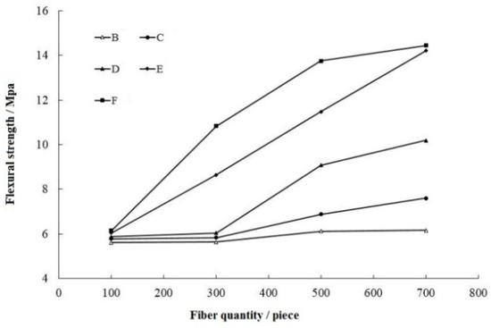 When 500 steel fibers are added into concrete, the flexural strengths for groups B-3, C-3, D-3, E-3, and F-3 are 6.11 MPa, 6.87 MPa, 9.07 MPa, 11.47 MPa, and 13.75 MPa, respectively, increasing 8.5%, 17.8%, 50.1%, 32.6%, and 27.0% compared with group A-1. After the steel fiber length increases to a certain extent, increasing the amount of steel fibers can significantly increase the number of steel fibers per unit area of the concrete, making the tensile properties of the steel fiber greatly impact the concrete properties.