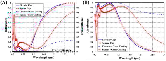 First, the impact of changing the cap shape and surrounding coating on the optical spectra of the MA absorber has been investigated. Figure 2 presents the transmittance, reflectance, and absorbance spectra of the proposed broadband plasmonic absorber for structures with circular and square caps coated with air and glass surrounding layers throughout the wavelength window (0.3–3 µm).