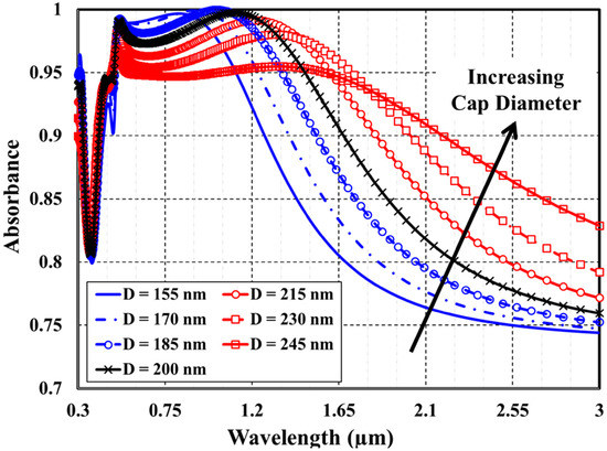 Second, we have investigated the impact of modifying both the cap diameter and substrate pitch, independently and collaboratively, on the optical absorption spectra of the MA absorber. Figure 3 illustrates some examples of the absorption spectra of the designed structure at different values of the cap diameter D. The diameter has been changed within a range of 155–245 nm with a 15 nm step size. At the same time, the silver substrate pitch, substrate thickness, top titanium layer thickness, and SiO2 dielectric spacer layer thickness are kept constant at 250 nm, 200 nm, 20 nm, and 80, respectively. The impact of varying substrate pitch, in the range of 205–245 nm, on the absorption spectra of the proposed plasmonic absorber is exhibited in Figure 4. The cap diameter is kept fixed at 200 nm.