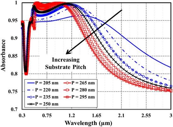 As demonstrated in Figure 3, the absorption bandwidth becomes more expansive and absorbance decreases as the cap diameter increases. In the visible region, the destructive interference of the scattered light may cause absorption quenching. In the infra-red regime, the localized surface plasmon resonance enhances the forward scattering and boosts the absorption bandwidth. An opposite behavior is noticed in Figure 4. As the photonic lattice pitch increases, the absorption bandwidth becomes more narrow and the absorbance increases.