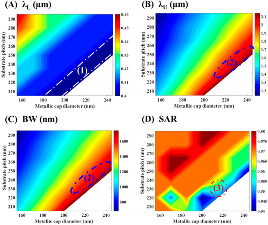 The results of Figure 5A exhibit the presence of region (1), between the white dotted lines, associated with minimum λL below 400 nm. That region is designed to target the broad bandwidth. We can select the proper values of the cap diameter D and the substrate pitch P within that region to ensure that the proposed absorber can snare optical energy efficiently in the visible part. In Figure 5B,C, the blue oval indicates the area (2) corresponding to superior absorption bandwidth and upper wavelength. Finally, at region (3) in Figure 5D, a maximum average spectral absorption rate of 95% is picked out at D ≈ 210–220 nm and P = 230–240 nm.