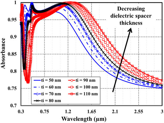 Then, to finish our investigation of the four featured structural parameters, the impact of modifying the thickness of both the top metallic layer and the dielectric spacer separately and concurrently on the optical absorption spectra of the MA absorber has been studied. Figure 6 demonstrates some samples of the absorption spectra of the proposed absorber at various values of the top metallic layer thickness tm. The titanium layer thickness has been modified within a range of 5–35 nm with 5 nm step size. At the same time, the silver substrate pitch, substrate thickness, cap diameter, and SiO2 dielectric spacer layer thickness are kept constant at 250 nm, 200 nm, 200 nm, and 80, respectively. The impact of modifying dielectric spacer thickness ti, in the range of 50–110 nm, on the absorption spectra of the plasmonic structure is exhibited in Figure 7. The titanium layer thickness is kept fixed at 20 nm.