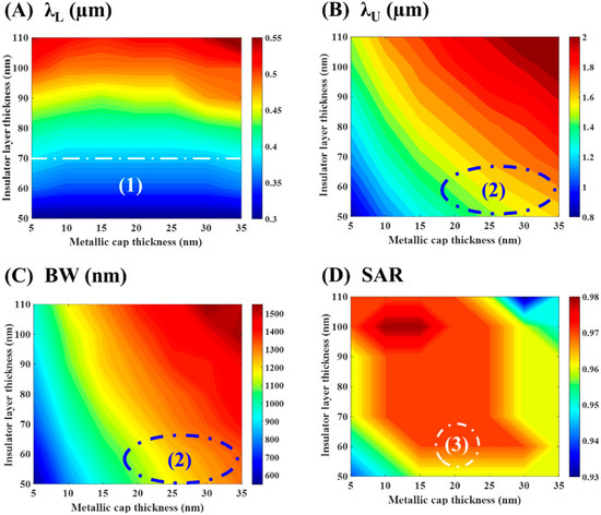 As demonstrated in Figure 6 and Figure 7, the absorption bandwidth becomes more expansive and absorbance decreases as either the thickness of top metallic layer or the dielectric spacer increases. Increasing the plasmonic resonator length causes broadening of the absorption spectra. In a similar manner, Figure 8 presents a concurrent study of (A) λL, (B) λU, (C) BW, and (D) SAR as a function of both the thickness of top metallic layer and the dielectric spacer.