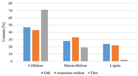 The content of cellulose, hemicellulose and lignin in oak, American walnut and flax [2,26,27,28].