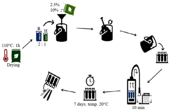 The test specimens were produced by the casting method with the use of a vacuum pump (−0.8 bar). The process is shown schematically in Figure 2 and is described in detail below. The materials produced are summarized in Table 1. Plastic test tubes were used as the molds, which made it possible to obtain cylindrical samples.