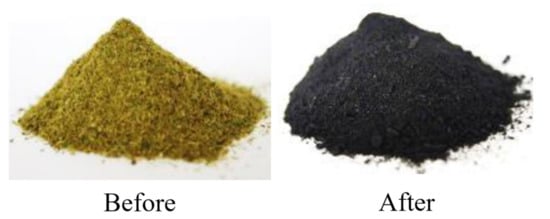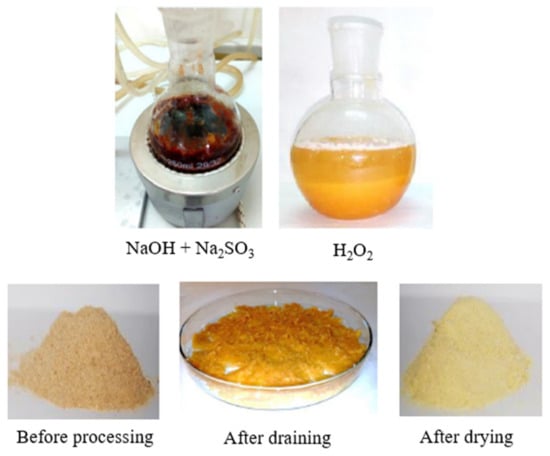 Chemical modification of the material was performed in order to remove lignin, pectins and waxes from the material, according to the recipe presented by the team of Mingwei Zhu [11]. NaOH (2.5 mol/dm3) and Na2SO3 (0.4 mol/dm3) were dissolved in distilled water, and wood flour was added. The solutions were heated to a boil and then boiled for 3 h. After this time, the supernatant solution was removed, and the residue was taken up in 30% hydrogen peroxide. After 30 min, the operations were repeated, the solution was decanted from the meal and hydrogen peroxide was added. After decanting the solution, the resulting material started to dry. The subsequent stages of modification are shown in the form of photos in Figure 4. The powder was carbonized at 1000 °C, presented in Figure 5 in the form of photos before and after the modification.