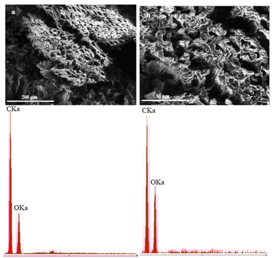Wood flour before chemical treatment (a)—magnification 350× and after chemical treatment (b)—magnification 1000× and below adequate EDS results.