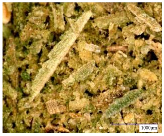 In order to determine the mechanical properties, the behavior of the samples during the three-point bending test and the compression test was assessed. The bending test was carried out on a Zwick 1435 machine (Zwick: Geisa, Germany) according to PN-EN ISO 178. The support spacing was set at 35 mm. The compression test was carried out on a TIRAtest 2300 testing machine (TIRA GmbH: Schalkau, Germany) according to PN-EN ISO 604:2006. The sample was compressed at a speed of 1.00 mm/min. The evaluation of mechanical properties (fracture toughness) under dynamic loads was made based on an impact test carried out with a Charpy pendulum hammer (VEB Werkstoffprüfmaschinen Leipzig, Leipzig, Germany). Unnotched samples with an area of 1.33 mm2, placed at a distance of 0.38 m from the axis of the hammer pendulum, were broken with one hammer blow, weighing 6.915 kg. Microscopic observations of plant additives and produced biocomposites were carried out using the NOVA NANO SEM 200 (Thermo Fisher: Waltham, MA, USA) scanning electron microscope (cooperating with the EDS analyzer) and the EDS microanalysis, allowing the identification of chemical elements included in the tested samples. Since the samples analyzed with the scanning microscope must be electrically conductive, it was necessary to spray the samples with carbon before proceeding with the test. The specimens were attached with a carbon tape, which ensures the discharge of charges from them. Plant components were subjected to microscopic observations using the KEYENCE VHS digital microscope (Keyence: Osaka, Japan). The thermal stability was determined based on the thermogravimetric analysis (TG) and the differential thermogravimetric analysis (DTG). Measurements were made using a NETZSCH STA 449 F3 thermal analyzer (AZoM: Bellevue, WA, USA) in a nitrogen atmosphere. The samples, weighing about 10 mg, were placed in an Al2O3 crucible and heated from room temperature to 1000 °C at a rate of 10 °C/min. The density of the obtained materials was determined by geometric and hydrostatic methods (taking into account the porosity). Infrared spectroscopy (FTIR) was carried out using a BRUKER TENSOR 27 spectrometer (Keyence: Osaka, Japan) with the attenuated total reflection (ATR) technique with a diamond crystal in the mid-infrared range of 4000–600 cm−1, with a resolution of 4 cm−1 and the number of scans of 64.