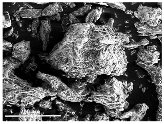 The last of the additives used was microcrystalline cellulose, the SEM image shown in Figure 12. This form is characterized by different crystal sizes, being an agglomerate of smaller elements. The surface of the crystals is uneven with sharp edges.